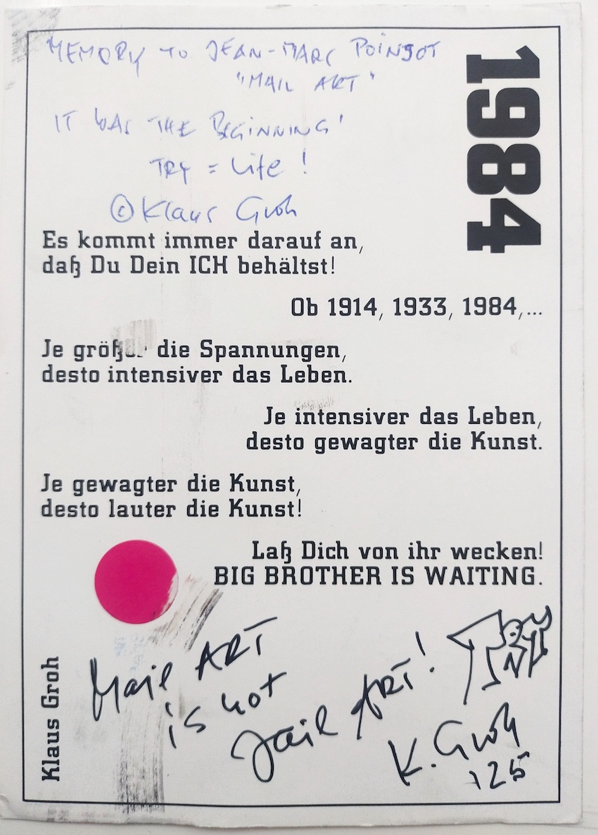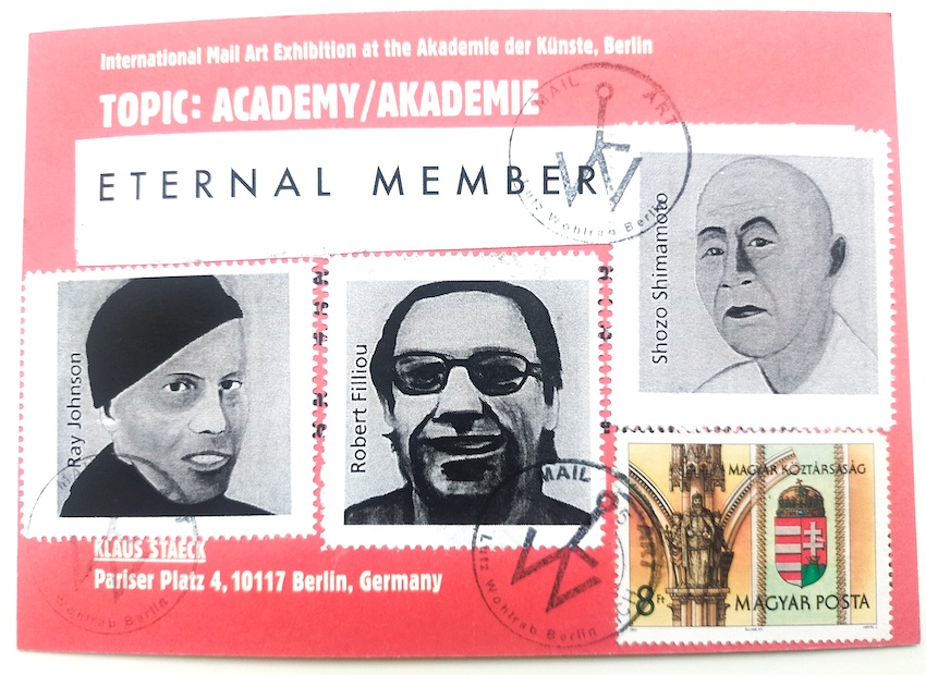 Avec/ With : Martine Aballéa, Peter Abajkovics, Anne Abou, Frédéric Acquaviva, Démosthène Agrafiotis, Fernando Aguiar, Jean-Michel Alberola, Christian Alle, Elisabeth Amblard, Giovanni Anceschi, AooA, Karel Appel, Argillia, Arman, Atelier Populaire, Enrico Baj, Melanie Bäreis, Vittore Baroni, Paul Bazin, Francesca Bella, Valérie Belin, John Bennett, Ottmar Bergmann, Pedro Bericat, Joseph Beuys, Daphné Bitchatch, Caroline Bittermann, Julien Blaine, Sarah Bodman, Christian Boltanski, Mario Borillo, Jean-François Bory, Daniel C. Boyer, BP (Renaud Layrac, Frédéric Pohl, Richard Bellon), Hans Braumüller, George Brecht, Marcel Broodthaers, Camille Bryen, Dmitry Bulatov, Alfonso Caccavale, Agnès Caffier, Angela Caporaso, Isabelle Caraés, Bettina Carl, Christiane Carré, Oriane Castel, Guglielmo Achille Cavellini, Cozette de Charmoy, Roberta Chiarella, Paella Chimicos, Henri Chopin, Joel Cohen, Michel Collet, William Copley, Michel Corfou, Periklis Costopoulos, Réjean F. Côté (Circulaire 132), Jean-Claude Courval, DADANAUTIK, Daniel Daligand, Hanne Darboven, Jean Degottex, Ma Desheng, Erik Dietmann, Ferruccio Dragoni, Jerry Dreva, François Dufrêne, Jean-Jacques Dumont, Leif Elggrenn, Öyvind Fahlström, Bartolomé Ferrando, Luc Fierens, Robert Filliou, Ken Friedman, Thorsten Fuhrmann, Marco Furia, György Galántai, Christophe Galatry, Jakob Gautel, Antonia Gennimata, Paul-Armand Gette, Gilbert & George, Liliane Giraudon, John Giorno, Michel Giroud, Ferdinand Glenk, Yves Gobart, Susan Gold, Guillaume Goutal, Klaus Groh, Brion Gysin, Richard Hamilton, Sten Hanson, Raoul Hausmann, Bernard Heidsieck, John Held Jr., Karl Horst Hödicke, Risto Holopainen, Joël Hubaut, Joseph W. Huber, Alice Hutchins, Olivier-Franck Huyghe, Dorothy Iannone, Katrin Jaquet, Gerald Jatzek, Jef Aérosol, Birger Jesch, Ray Johnson, Ana Jotta, Detlef Kappis, Jason Karaïndros, Alison Keenan, Ellsworth Kelly, Alison Knowles, Arthur Køpcke, Jannis Kounellis, Serafine Christine Kratze, Susanna Lakner, François Lagarde, Jean-Jacques Lebel, Stéphane Lecomte, Jean Le Gac, Jean-Claude Lefevre, Ben Leenen, Alexis Lemoine, Bob Lens, Siggi Liersch, Eloise Lifton, Andre Lisangi, Virginie Loreau, Gaëlle Lucas, Henri Maccheroni, George Maciunas, Brice Marden, Richard Martel, Olive Martin, M. Chat, Katerina Mandarik, Chris Marker, Annette Messager, MH//ANTIPODE, Stephan J. Mitterwierser, Susanne Mitterwieser, Alex Mlynarcik, Mohammed (aka Plinio Mesciulam), Malcom Morley, Côme Mosta-Heirt, Martine Mougin, Tania Mouraud, Massimo Mori, Valérie Mréjen, Gabriele Müller, Christa Näher, Gerald Naar, Keiichi Nakamura, Seigne Ndiaye, Seth Nicemail, Boris Nieslony, Andrew Maximilian Niss, Guttorm Nordö, Zorica Obradovic, Jürgen O. Olbrich, Pauline Oliveros, Yoko Ono, Jeremie Otternbach, Asma Ounine, Marco Pachetti, Clemente Padin, Nam June Paik, Bogdan Pavlovic, Claude Pélieu, Rémy Pénard, Ben Patterson, Pierre Petit, Ségolène Perrot, Horvath Piroska, Pete Pistol, PLG, Hugo Pontes, Morgane Porcheron, Plonk & Replonk, Rittiner & Gomez, Gabriel Pomerand, Hugo Pontes, Jérôme Rappanello, Serge-Henri Rodin, Yvonne Roeb, Robic Roesz, Dieter Rot(h), Francis van Rossem, Edward Ruscha, Robert Ryman, Carmela Sarcina, Abderrazak Sarenco, Antonio Sassu (Gruppo Sinestetico), Roberto Scala, Michel Seuphor, Takahachi Shohachiro, Lars Schumacher, Susanne Schumacher, Renate Schweizer, Esther Ségal, Tanabe Shin, Adrian Sorin Sinescu, Judith Skolnick, Christine Smilovici, Snappy, Daniel Spoerri, Klaus Staeck, Giovanni e Renata StraDA DA, Cannelle Tanc, Paul-André Tanc, Irina Tall, Ulrich Tarlatt, Romain Théobald, Miroslav Tichy, Tofu, Tonelli, Roland Topor, Endre Tót, Horst Tress, Richard Tuttle, Ben Vautier, Michel Della Vedova, Valentine Verhaeghe, Martine Viale, Jacques de la Villeglé, Frédéric Vincent, Yoshi Wada, Eric Watier, Robert Watts, Rainer Wieczorek, Ruth Wolf-Rehfeldt, Henri van Zanten, Tom Westermann, Lutz Wohlrab, Gil Wolman, Reid Wood, Dana Wyse, Max Wyse